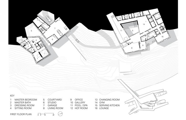 The building takes an anti-heroic stance and constructs a sequential living experience oriented to the beauty of the lake and the wooded landscape. The building is less ‘object’ and more the result of the spatial experience of moving through the sculptural landforms weaving in and out, up, down and through the topography of the hillside. Upon arrival to the house from the drive, the long view to the lake disguises the presence of generous residential spaces for living and recreation below.