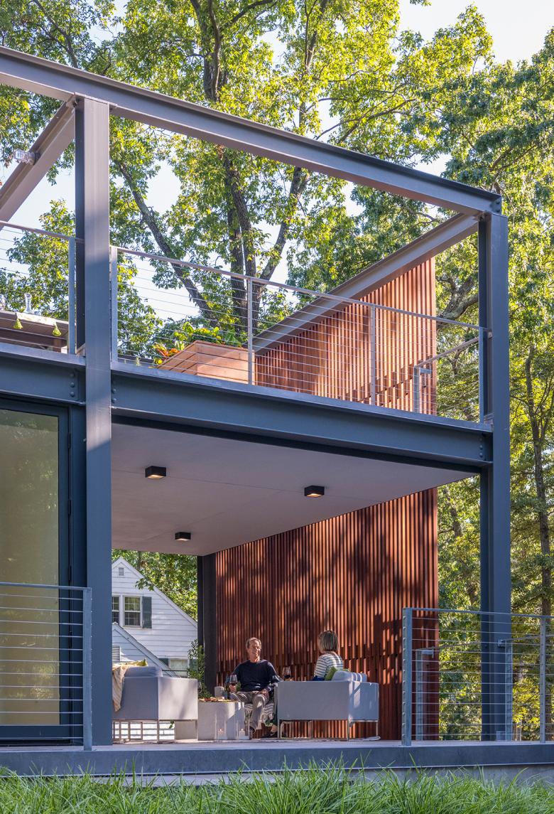 Inspiration for the roof deck was found in the roof terrace of Villa Savoye, Le Corbusier and Pierre Jeanneret’s 1931 masterpiece. Rather than leave the third level completely exposed, the steel frame continues upward to reinforce the idea of an outdoor room.