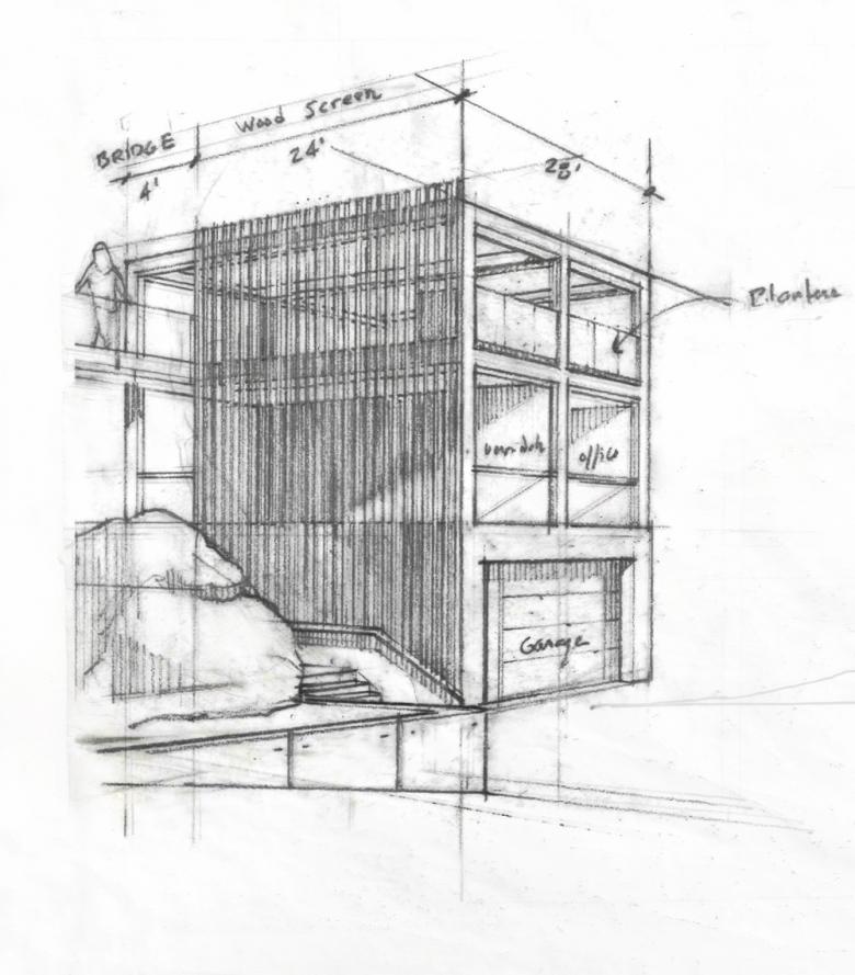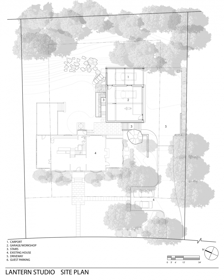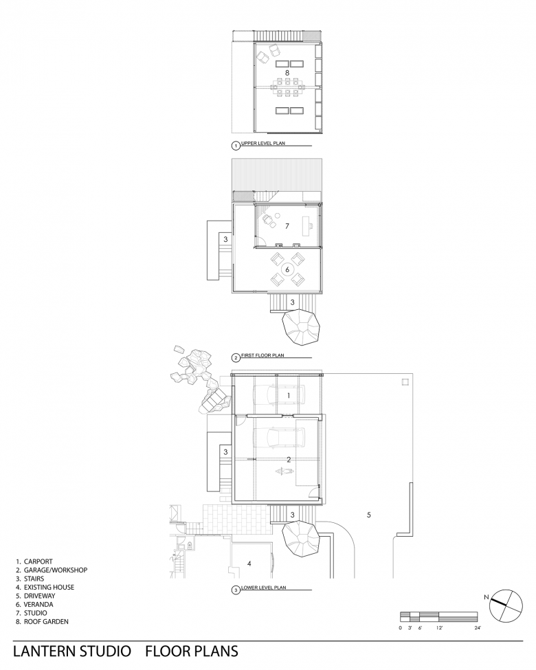 This free-standing garden building is conceived as a creative sanctuary from the busy day-to-day life of the home. Working from the idea that our best and most creative work is done in a calm space with minimal distractions, each level of the building is a retreat for the client’s creative passions of antique Vespa scooter restoration, writing, antique fountain pen repair, and vegetable gardening. The lowest level, bermed into the sloping site contains the 673-sf garage workshop to repair antique Vespa scooters. Additional covered parking is provided under an adjacent carport with exposed steel beams topped with metal corrugated roofing. On the middle floor, set a few steps above the backyard, is the only fully conditioned space, the 252-sf writer’s retreat, also serves for repairing fountain pens. The balance of the middle floor is an open-air veranda, which gets its privacy from the street by a 3-story mahogany screen. The top level is a 590-sf roof deck, providing a haven for vegetable gardening, away from deer and squirrels that plague ground-level. An outdoor dining table and chairs surrounded by planters inspires farm-to-table entertaining.