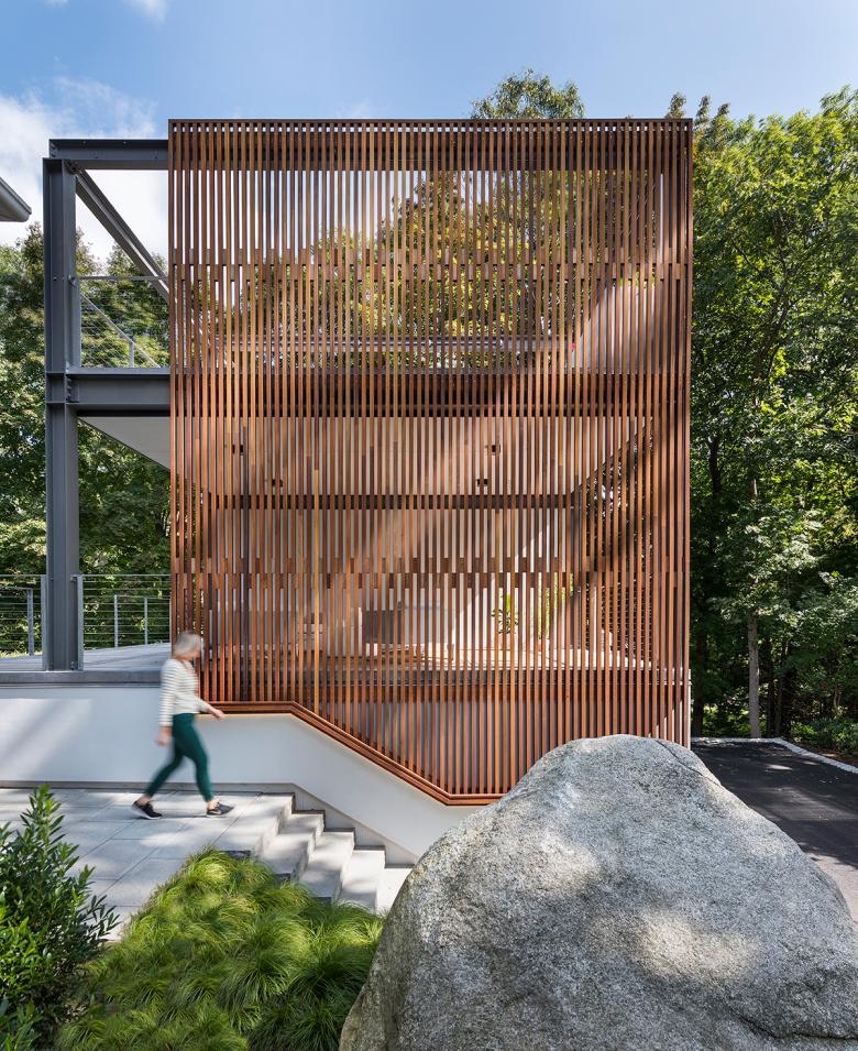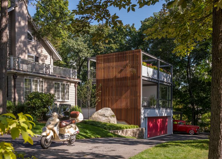 Flavin Architects conceived a retreat built of steel, wood, and concrete. We situated the structure in an existing garden behind a Dutch Colonial home in Wellesley, Massachusetts. While it is visible from the street, the setback respects the context: suburban houses host their accessory garages behind primary dwellings. The three-story, free-standing garden building offers a sanctuary from the busy day-to-day life of the home. The structural steel frame of the building is left exposed. A mahogany screen drapes the street-facing side of the structure, creating privacy for the client and catching the dappled light that filters through the surrounding trees.