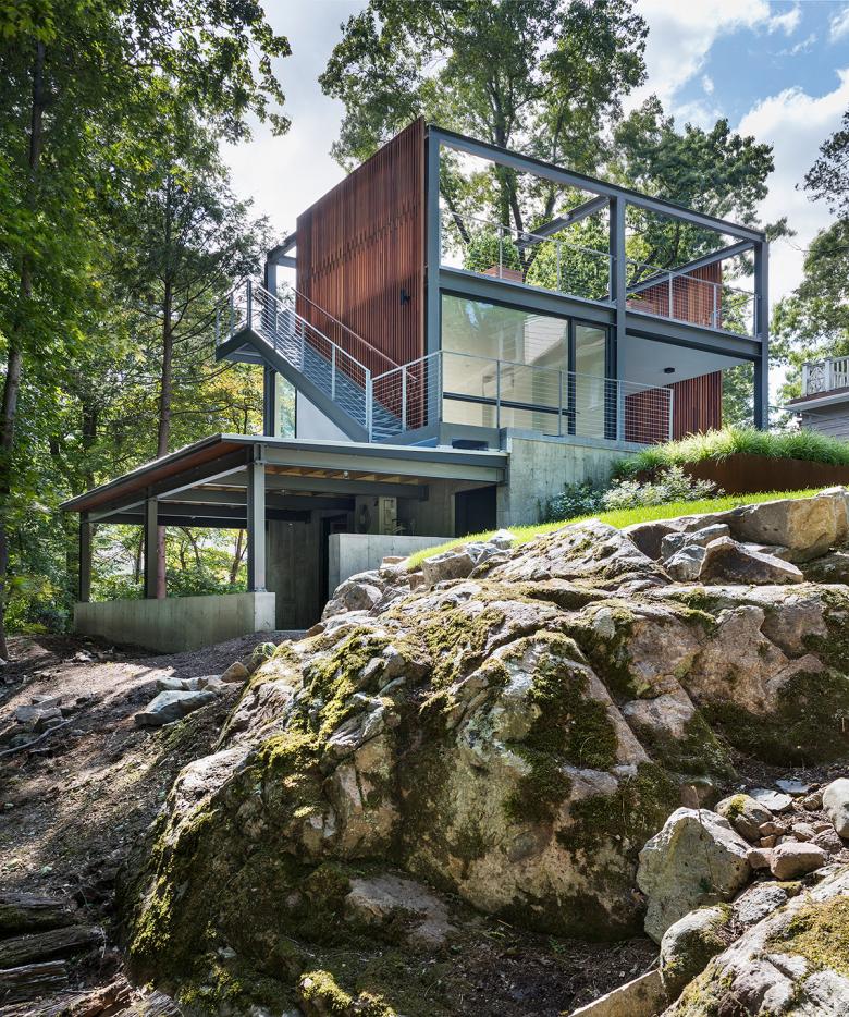 The building is placed directly behind a spectacular glacial erratic boulder. The boulder becomes the focal point of the backyard entrance while the monolithic stone stairs wind directly behind it. Low grasses are planted around the boulder, in keeping with the manicured gardens typical of the neighborhood. The landscape to the rear of the lot is left raw and wild, with rock outcroppings that nature can overtake in time.