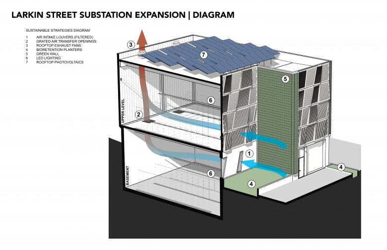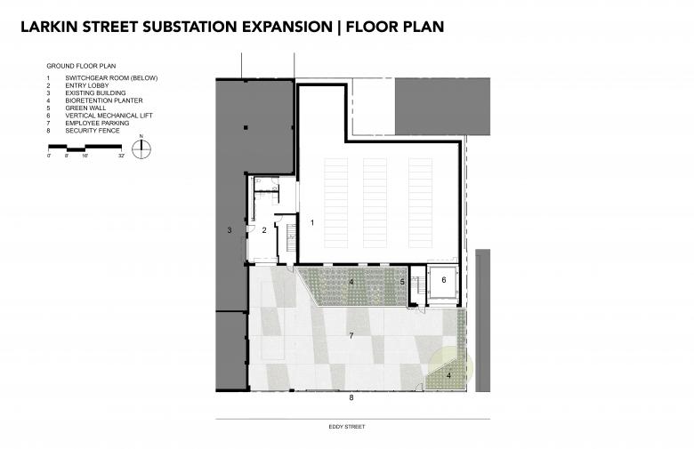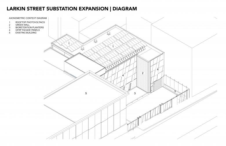 Tucked mid block on Eddy Street between Larkin and Hyde, in San Francisco’s famously gritty Tenderloin neighborhood, the 12,200-square-foot expansion to an historic 1962 electrical substation represents a couple of “firsts” in environmental stewardship. Housing critical electrical infrastructure as well as storage and support space, the one-story-plus-basement addition also features a faceted facade and lush green wall that lend welcome aesthetic relief to the otherwise gritty urban fabric of the surrounding neighborhood.