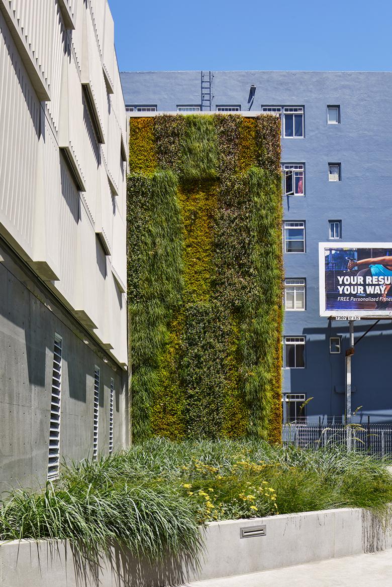 Lastly, to comply with the city's stormwater control requirements, two bioretention planters are located at grade (both roof and site runoff is directed to these planters) along with a vertical green wall which additionally brings a moment of biophilia to the urban location.