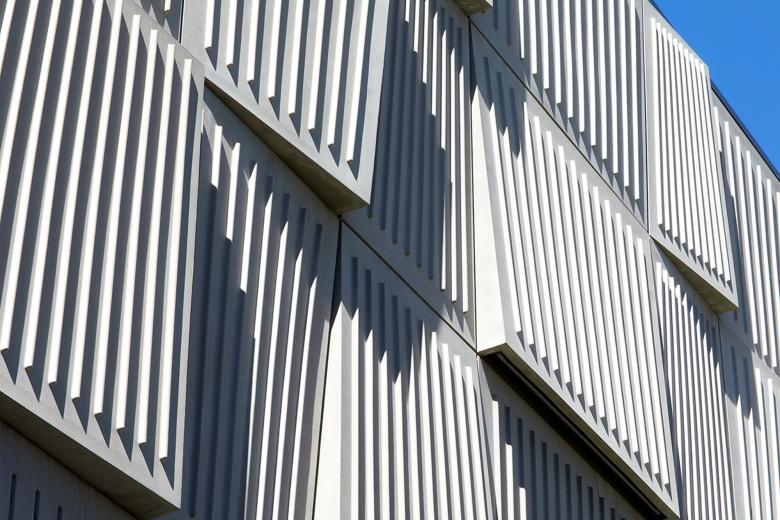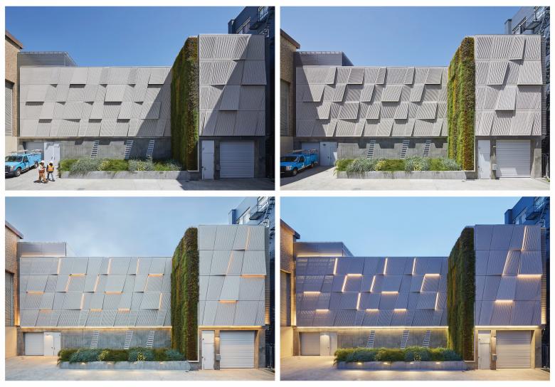 The building features rainscreens that integrate three types of individually modeled glass-fiber-reinforced-polymer (GFRP) panels. Together, they form a faceted facade — an abstraction of the substation’s service area — that casts ever-changing shadow patterns across its surface throughout the day and year. At night, sloped panels embedded with light fixtures pulsate across the building, expressing the city’s dynamic electrical power grid. The lighting also enhances safety and security within and around the project. To reduce light pollution to the largely commercial and residential surroundings, the design team directed light downward onto the facade and site.