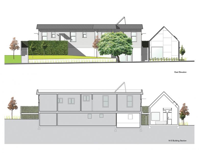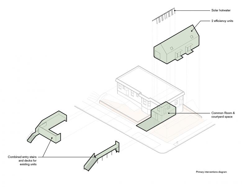 The initial site planning move of locating the two new units on the north end of the site formed an 'L' shaped configuration with the existing building creates a shared courtyard at the heart of the site. This courtyard is then the extension to the new common room which was previously the garage. In this way, the project reflects and facilitates a critically important element of the recovery process — community.