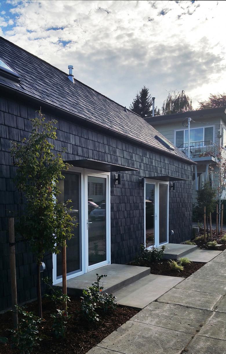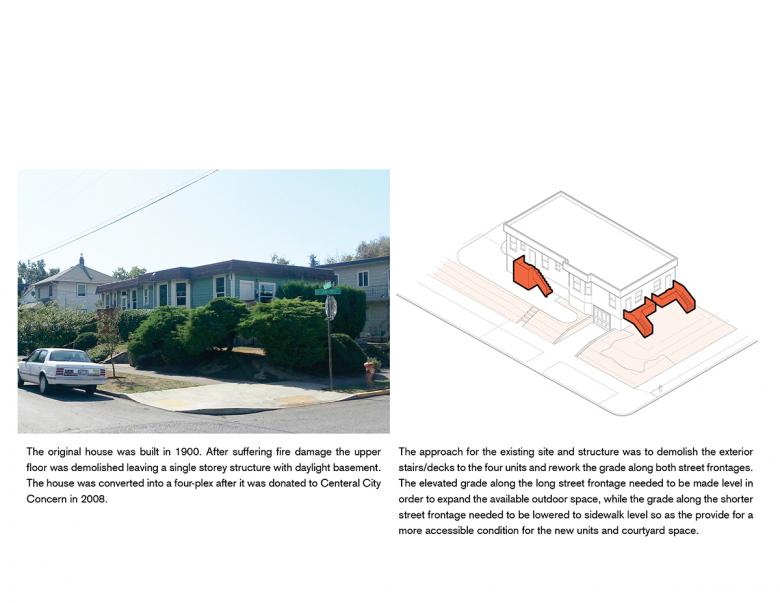 The Common Room and expanded outdoor areas were added by renovating the existing garage and providing new lawn areas and shared entry decks. The safety and security of the facility was improved through a comprehensive redesign of the site providing well defined points of access to the individual units, new site and entry lighting, and redesigned landscaping that creates greater visibility of the facility.