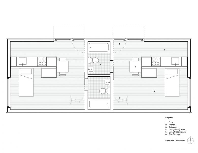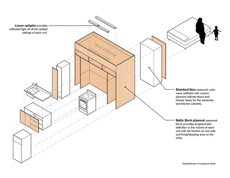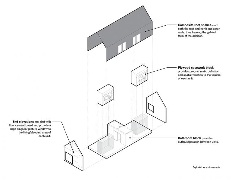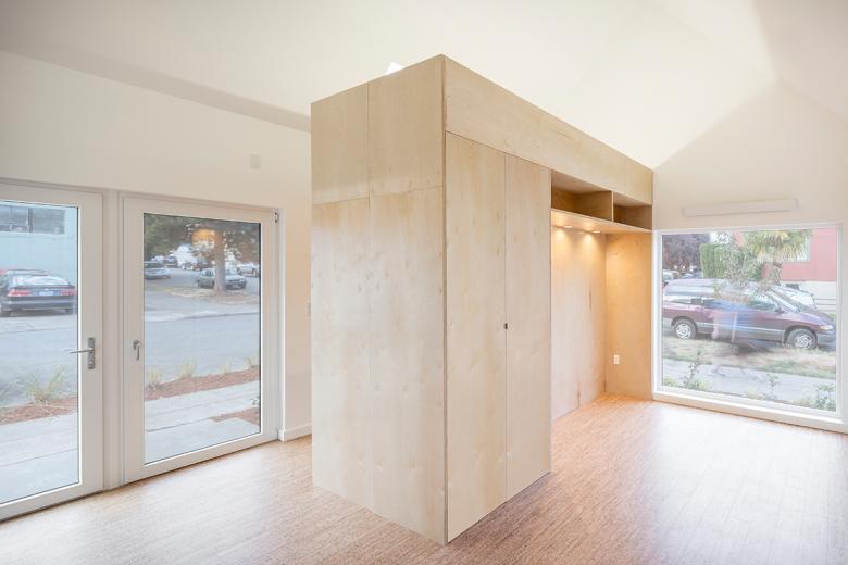 The two new 330-sf units are comprised of a small kitchen, living and sleeping area, and bathroom. Each unit is conceived as a single generous volume that is programmatically defined by the placement of a plywood casework block. One side of the block creates the kitchen, and the other side creates the living and sleeping area. In this way the domesticity of each unit is made more complex through the subtle creation of multiple spatial conditions within a simple volume.