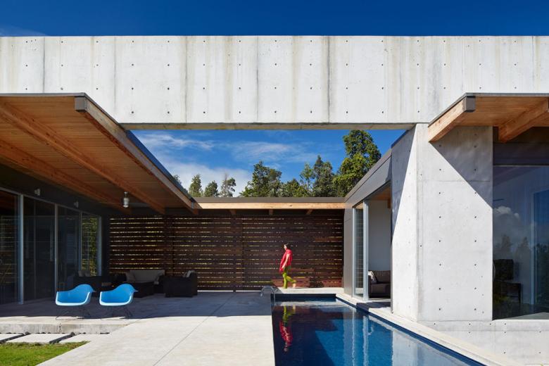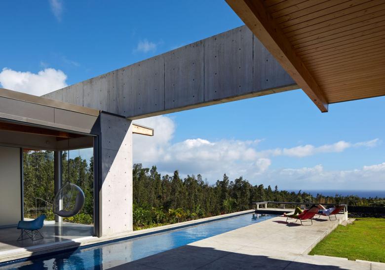 The building is located in a dense Ohia forest. It was important to us to create a building that complements and embraces this environment. The main feature of the house is a 140 ft. long concrete beam with only three short walls supporting its massive span. The concrete beam allows for sizeable spans of uninterrupted glass and covered outdoor space, which creates a permeable edge between the man-made and nature. These huge expanses of openness amplify the sensation of living in the Ohia forest.