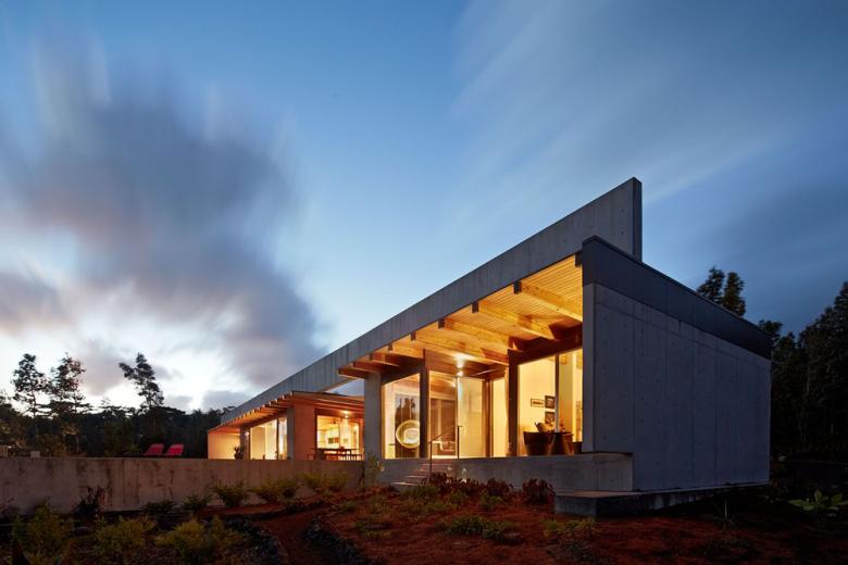 The Island of Hawai'i (aka the Big Island) is made up of five volcanoes and their lava flows—two volcanoes are still active, so the island keeps growing. With this geologic condition, it is no surprise that architect Craig Steely calls the modern houses he has designed on the island "Lavaflow." Number 1 was built literally on a lava flow, and the most recent house, Number 7, is situated within a native Ohia forest. Steely is influenced by the island's vernacular architecture, but the large concrete beam spanning the entire length of the house makes it clear that he embraces a simplified, modern idiom. Steely answered some questions about the project.