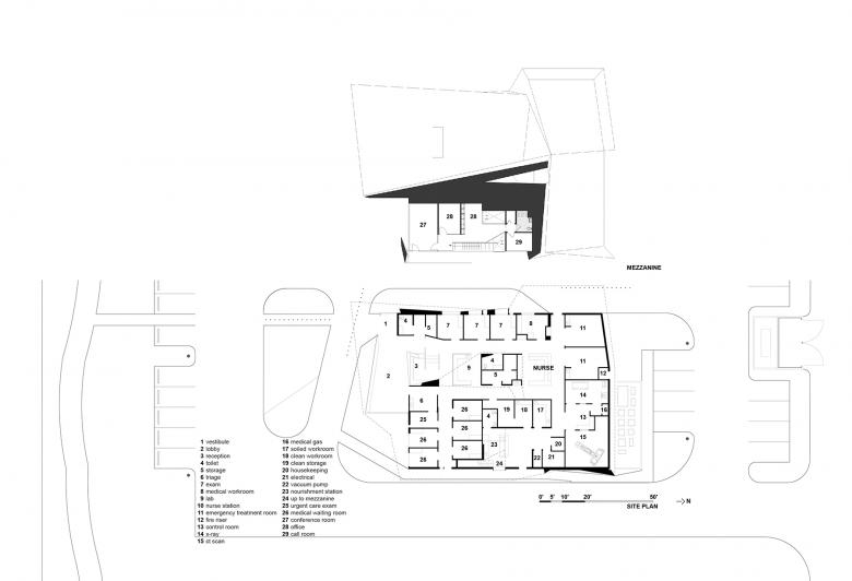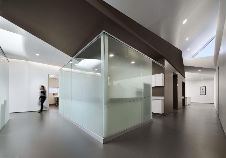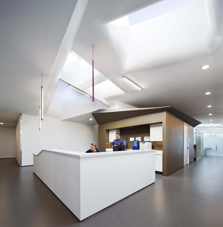The building integrated the principles of Evidence-Based Design within its spatial, circulatory, and sensory structure while being careful not to create a facility that could be perceived as overly methodical. Multiple skylights were situated at strategic intersections of the circulation to form a sensible system of way-finding. The components of workspaces were designed for peer collaboration, patient accessibility, and data privacy, while the patient care areas were crafted for hospitality and treatment efficacy to reduce errors in the administration of medicine. The off-stage environment of the medical staff was as well accounted for; the staff lounge and office areas were connected through a daylight-filled double-height space and were provided access to a balcony tucked under the zinc roof.