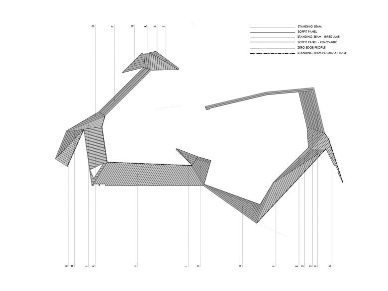 The building profile extrapolated the conventional residential roof planes and was given a new tectonic grammar to drive its programmatic transformation around the building. Gradient perforated panels were mapped onto the exterior surfaces to allow for diffusive building lighting and passive solar shading. Zinc, being the most sustainably-sourced metals for construction, was selected for its inherent greyish-blue warmth and resiliency during extreme Texas weather events. The zinc panels were patterned to maintain continuous readings of the vertical standing seams with knife-edged thickness along their planar perimeter.