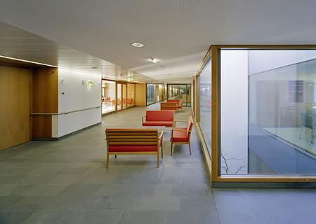 Gefordert waren drei Stationen (Chronisch Kranke, Akutgeriatrie, Rehab) mit 70 Betten, außerdem legte man großen Wert auf die künftige Erweiterbarkeit. Statisch und haustechnisch ist der Stahlbetonbau so ausgelegt, dass man ein Geschoß aufstocken kann. „Unsere Idee war, das bestehende System mit der Hauptachse, an die mehrere autonome Trakte angebunden sind, fortzuschreiben“, sagt Projektleiter Anton Kirchweger. In beiläufiger Selbstverständlichkeit klinkt sich der klare, nord-südorientierte Riegel mit Mittelgang in die Erschließung ein und fügt sich stimmig in die Kammstruktur. Er wird so zum vorläufig letzten Glied einer Kette, die sich durch den Neubau einer Lymphklinik im abfallenden Gelände problemlos fortsetzen lässt, ohne Lichteinfall und Blick der Geriatrie zu stören. (...) Isabella Marboe