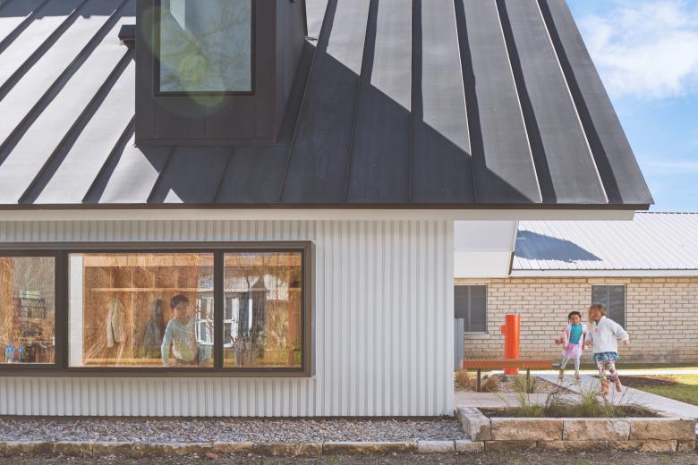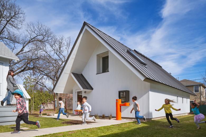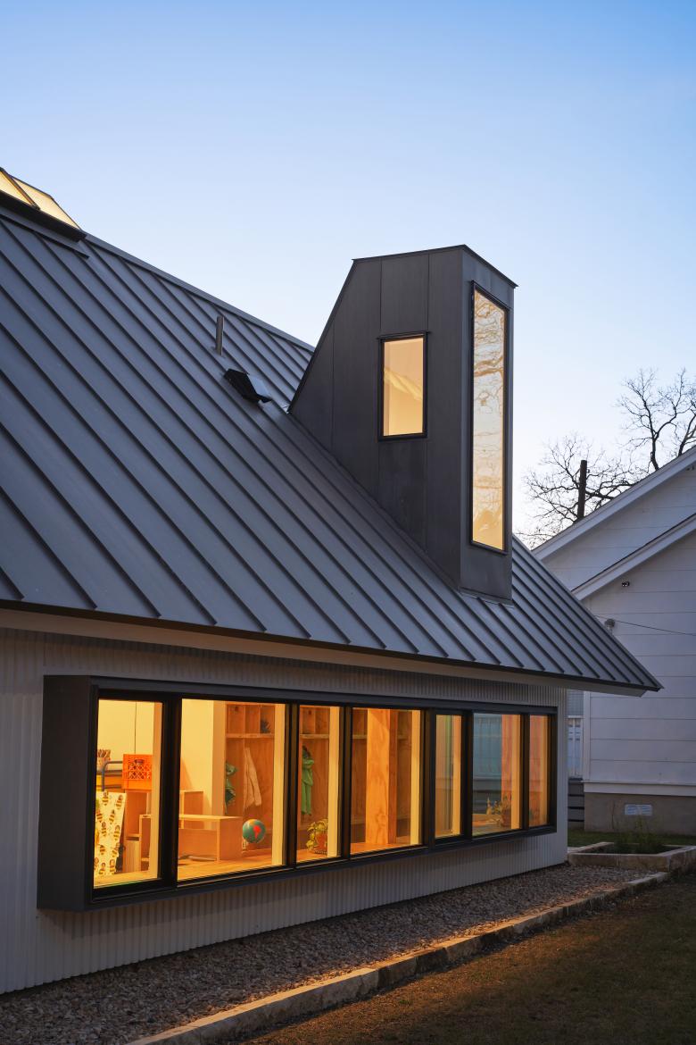 A prominent gable roof and small footprint help this new building for Little Tiger blend into its residential Austin, Texas neighborhood. A trio of openings – a ribbon window, a tall dormer, and a ridge skylight – bring plenty of light into the classroom building but also signal it is anything but traditional. Murray Legge Architecture answered a few questions about the project.