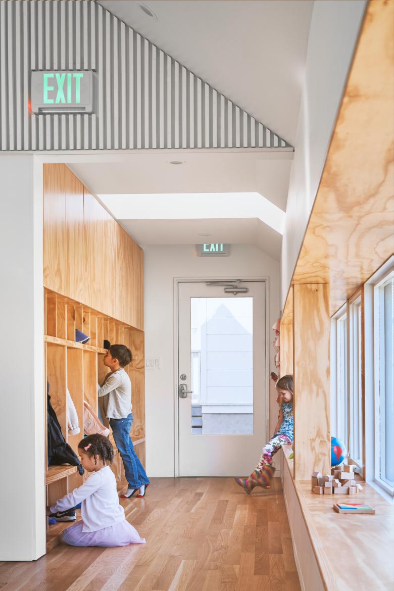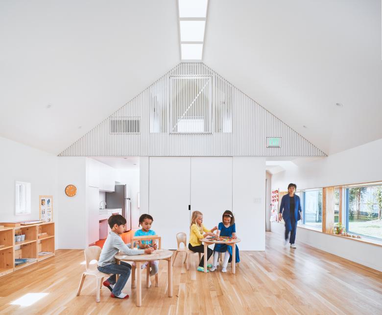 The building itself is inspired by the historic American one-room schoolhouse – with an iconic gable form, rectangular footprint, belfry, and single classroom space. Its size and scale is tailored to the primary occupants, all of whom are under four feet tall. The gable shape has very low eaves that reduce the scale of the building (an adult can touch the roof overhangs easily). All the windows in the classroom are child-height. A long, low window bay along the north wall doubles as a reading nook and built-in bench. The exterior material palette consists of white painted cement board and paint-grip metal, which fits into the neighborhood context and existing campus aesthetic.