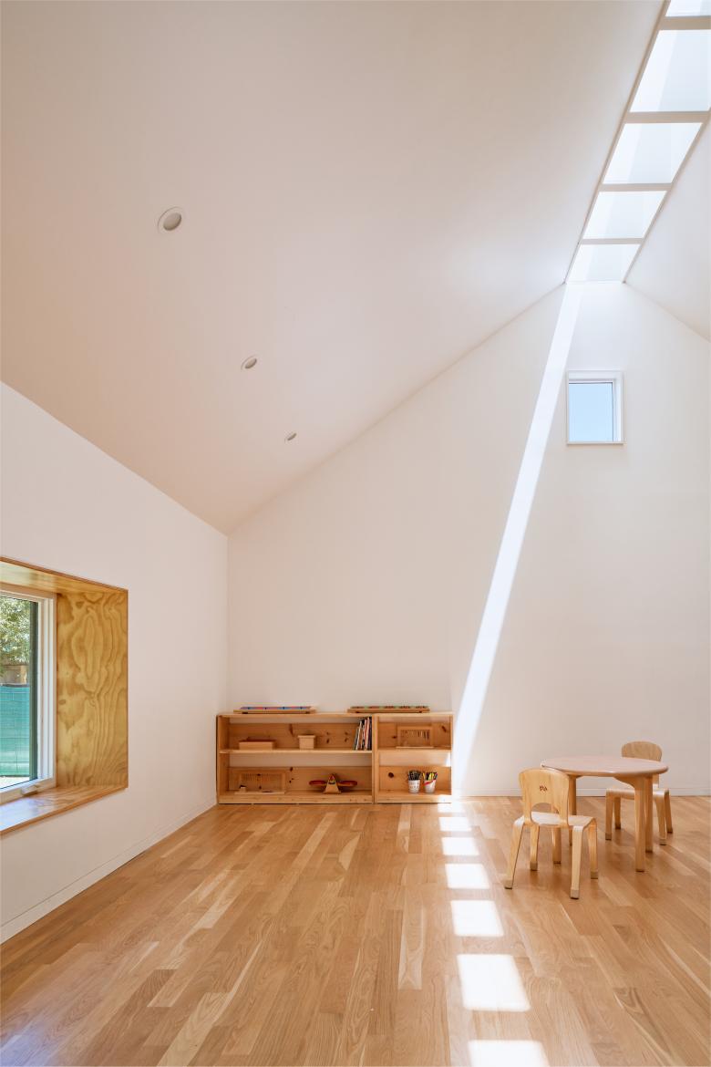 The main classroom is a single, vaulted space that accommodates 12-15 students. Abundant daylighting is provided by a continuous skylight along the peak of the roof that tempers the strong Texas sunlight through a series of deep vertical light baffles. During certain times of the year, small patches of sunlight dapple the floor: at all other times the light is diffuse and indirect.