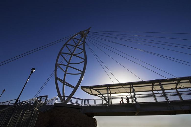 Spanning 170 feet, the Lone Tree Pedestrian Bridge is a cable-stayed structure. The 78-foot-tall, leaf-shaped mast structure rises on the south side of the long-span, cable-stayed bridge with six pairs of cables extending down to support the bridge deck. Open mesh on the sides of the bridge protect bridge users and the cars below, and an ETFE membrane roof provides protection from the elements. The roof is translucent, allowing sunlight to illuminate the bridge during the day, and the bridge lighting causes the roof to gently glow at night. Ramps on each end of the bridge allow easy access for those with disabilities, bicyclists, walkers, joggers and people pushing strollers.
