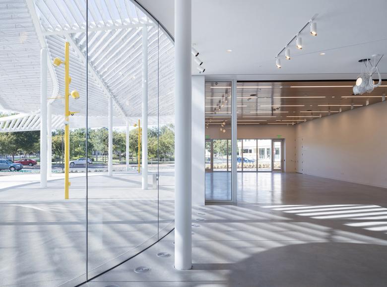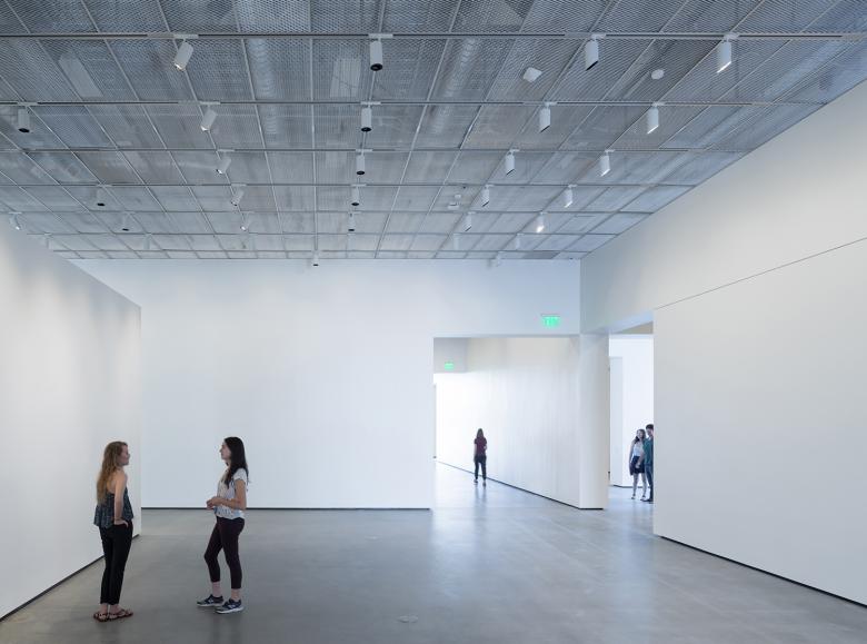 Inside the single-story 30,000-square-foot building is a portfolio of interconnected spaces, all with distinct spatial qualities and characteristics that trigger diverse activities. Gallery, education and operations pavilions are visibly connected via lightly polished concrete floors. Ceilings are custom aluminum mesh fitted with state-of-the-art occupant-controlled LED lighting, which enables effective illumination of a variety of media within close adjacency and accommodates natural light delivered by visible connections to the outside.