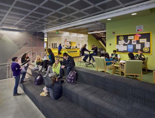 The design process was virtually fully realized in the constructed buildings. DLR Group‘s design arranges four, independent high school buildings around a central Campus Commons. These buildings are designed using a “shell and core” concept which locates the seismic and load-bearing steel structure and most plumbing out to the exterior walls, routes electrical and HVAC through floor and ceiling, and allows interior walls to be easily reconfigured over time to adapt to changes in educational program. With the addition of interior windows, movable walls, furniture on wheels, and ubiquitous technology, the design extends to allow for dynamic and integrated learning opportunities.