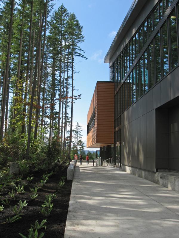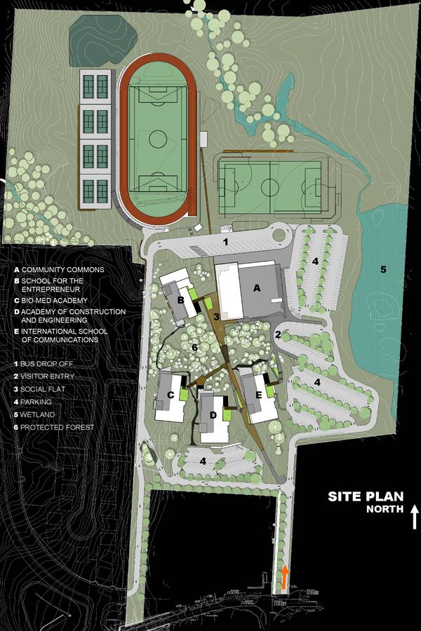 Preserving wetlands, old growth trees and forest understory was paramount to the siting of the school. The campus is composed of distinct three-story structures to reduce the total building footprint and minimize site impact while maximizing landscape preservation. Connected by boardwalks, the buildings nestle into the trees and sloping topography, while their orientation maximizes daylighting.