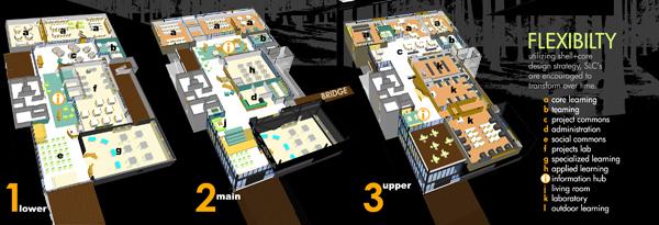 Rather late in the design process, the team had an opportunity to test the flexible design theory upon learning that one of the interested-based high schools (Global Studies) was unsubscribed and another would need to replace it. No problem! The building was quickly readapted to accommodate the Academy for Construction and Engineering.