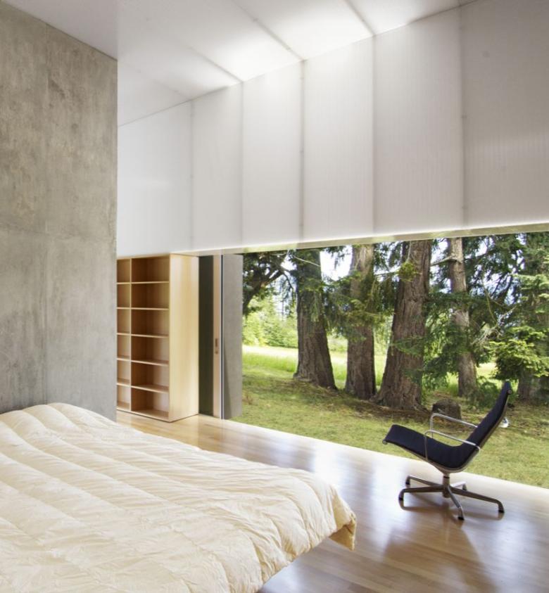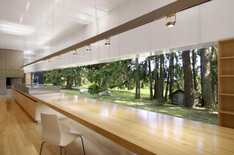 The climate of Saltspring Island, Mr. Patkau said, is like that of northern California: bright and temperate, and considerably drier than either Vancouver Island (which it’s near) or the B.C. mainland. Canadian nature loses its characteristic harshness in such a place, and asks to be allowed into the inner precincts of a dwelling. The Patkaus have generously obliged this request by opening up the long exterior surface of Linear House with enormous top-hung doors that, in fine weather, can slide away and disappear into the walls. The longest of these apertures extends a full 78 feet.
