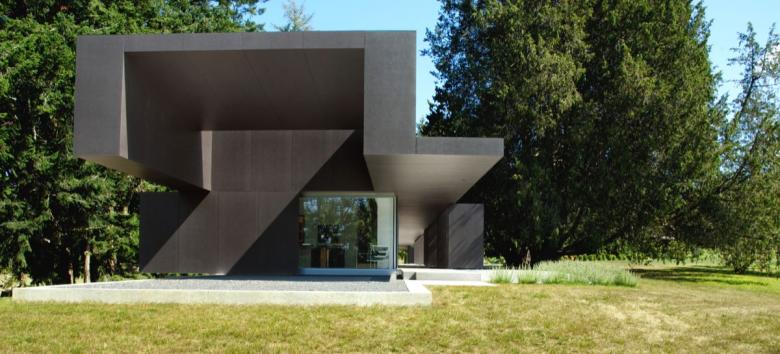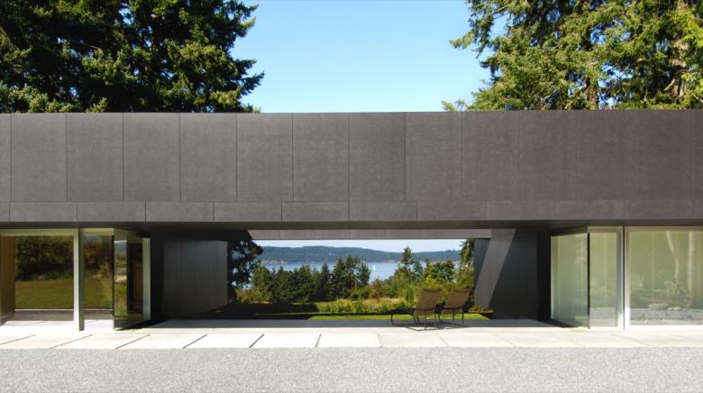 In a recent conversation, Mr. Patkau told me this dark cladding helps the house recede, almost to the point of invisibility, into its background of mature Douglas fir trees and other rural greenery. I’m prepared to believe that’s the effect in the real world, though in photographs the sombre siding makes the house’s exterior demeanour seem unduly aggressive.