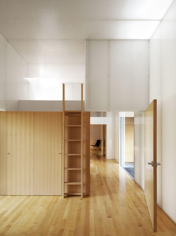 But be all that as it may, the interior of Linear House is a marvel of lightness, warmth and supple spatial flow. The streamlined millwork is made of maple. Instead of dropping in opaque drywall to define the various areas of this very open structure, the Patkaus have divided rooms and covered walls with translucent white plastic sheeting. The living, sleeping, cooking and dining areas are illuminated by sunshine falling through myriad skylights during the day; by night, fluorescent lighting scatters a soft glow throughout the white-surfaced interior.