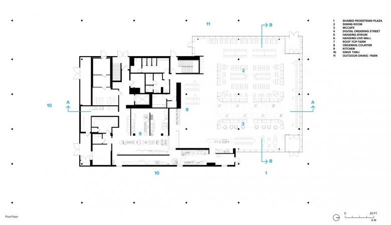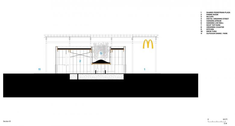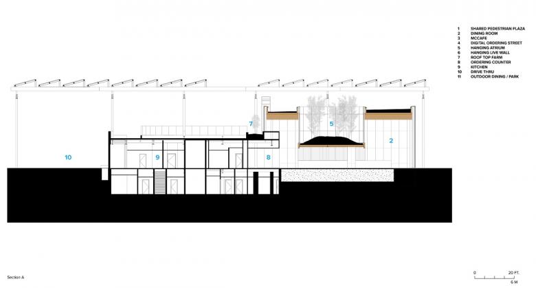 The dining room features a garden planted with ferns and white birch trees floating above a digital ordering “street”. From this vantage point guests can experience the landscape beyond and above. Over shared tables with wireless charging and outlets, "tapestries" of living plants improve indoor air quality and provide a backdrop of green gradients. What might surprise many can be found on the adjacent kitchen roof: a row of harvestable apple trees can be seen through a clerestory window, telling a story about the future of urban farming and the utilization of often underused space.
