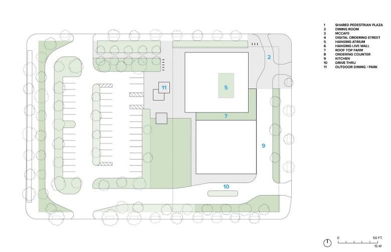 The site is a full city block, just steps off Michigan Avenue, occupied since 1983 by the iconic “Rock ‘n Roll” McDonalds that emphasized drive through services. The new design re-balances car-pedestrian traffic creating a city oasis where people can eat, drink and meet. Green space is expanded over 400%, producing a new park-like amenity for a dense area of the city.