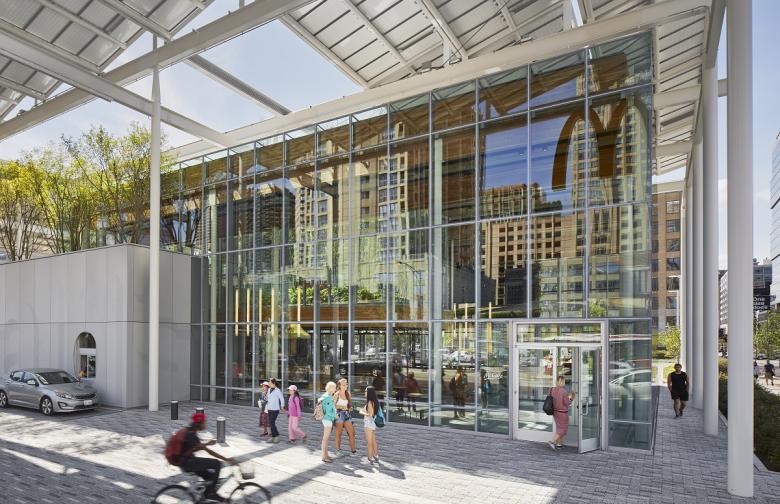 Where two 60-foot-tall Golden Arches once stood ― a symbol of the world's most famous fast-food chain's origins ― now sits a glass box capped by a green roof and a steel armature of photovoltaic panels: a symbol of McDonald's sustainable future. The McDonald's flagship in Chicago's River North neighborhood is equally striking inside, where apple trees are suspended behind glass walls and timber caps the open dining space. Ross Barney Architects sent us some information on their design of McDonald's Chicago Flagship.