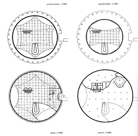 And, suddenly, flicking through Modern Architecture in Brazil, by Henrique Mindlin, I see a flying saucer with a thousand hatchways and an abrupt cut as an entrance. Intrigued, I went to visit it. Surprise: the building receives me with a boulevard of cylinders, straight, direct, elemental, powerful, compressed between two smooth plaques. The edges of the upper slab do not touch the dome's concavity, an eyelid facing the elliptical cut, insinuating a pictogram of an eye. Exactly halfway along, the ramp signals the transverse axis. The primordial plans come alive, the line, the cross, the circle; the centripetal and centrifugal impulses even out. Defined as an independent skeleton, without visible beams, the archetype of the directional spaces is inscribed in the archetype of the focal or radiant space, defined by the lowered dome. The echo of the Greco-Roman temple is repeated in a ziggurat whose platforms evoke the hexagons of Guarini's (1) baroque chapel and the projection of a pillow with its evocations of rest.