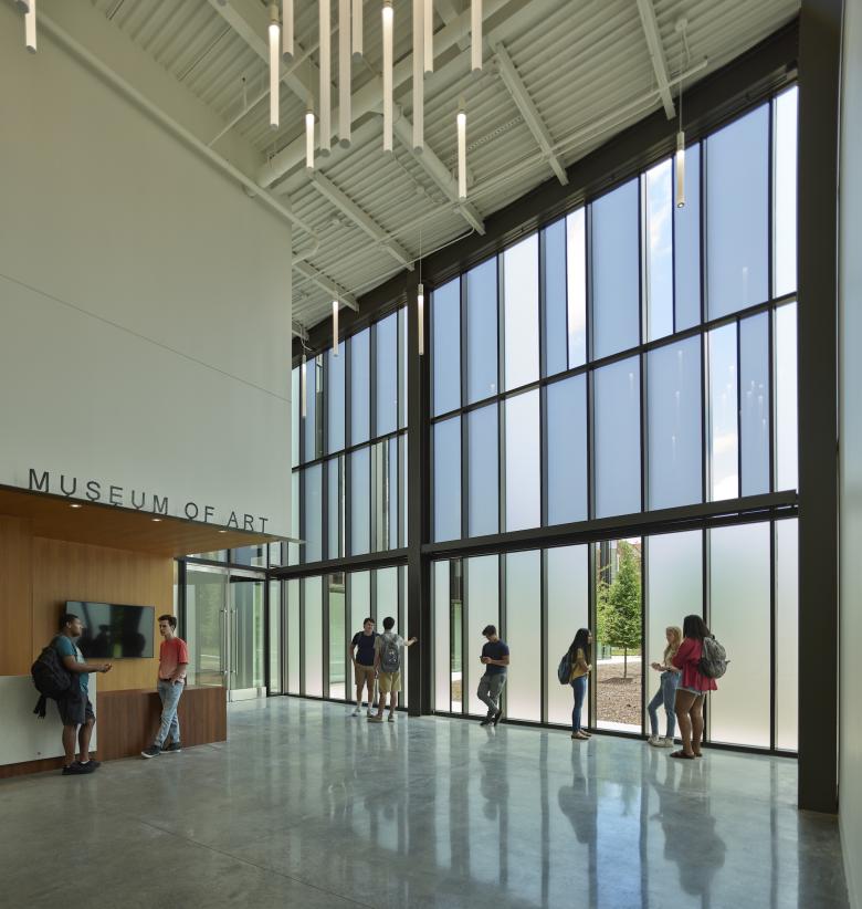 Though the building configuration is typical of many on campus (and uninterrupted on upper floors), the first floor is carved through along two separate axes in support of activating the quad and drawing people and activity through the site. The south wing of the ground level contains the college's music department, with offices, classrooms, conference and music rehearsal and practice rooms. The north wing houses the museum of art, with a large reception lobby, three separate galleries and their associated support spaces. The two slices through the ground floor create a third form, a two-story glass volume that encapsulates a 65-seat film screening theater.