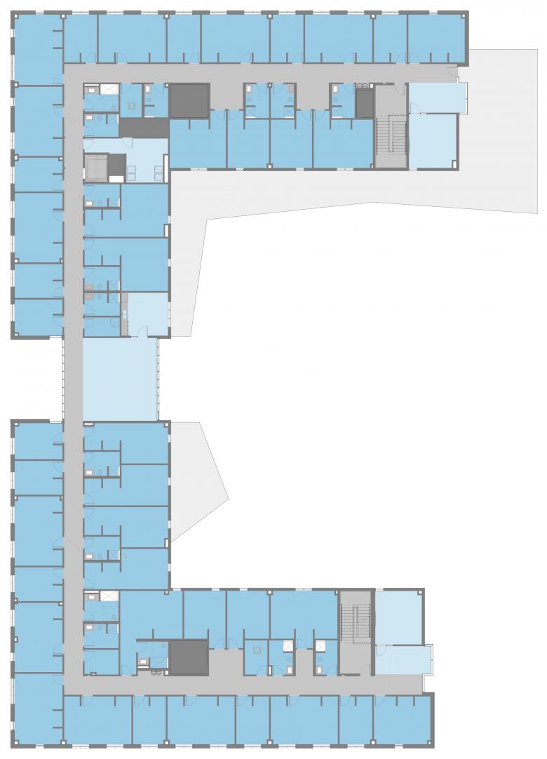 Accessed independently of first floor exhibition and pedagogical spaces, the second and third floors comprise a new residence hall for 106 students, featuring single and double rooms, kitchen areas, study lounges, and classroom space. Reinforcing student engagement with the arts, common areas and study rooms on the second floor are purposeful in providing visual connection to art galleries and common areas below, while outdoor covered patios and study spaces create a direct, physical link to the quad and exterior activities.