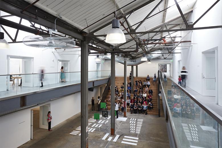 The design pivots around the renovation of a 1937 industrial warehouse. Preserving the rich textural qualities of the past while providing for a new vibrant arts occupancy was primary to the project. Original wood plank ceilings supported on delicate steel trusses define the new central atrium and exhibition space.