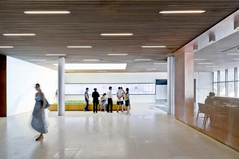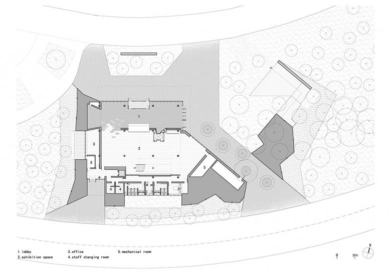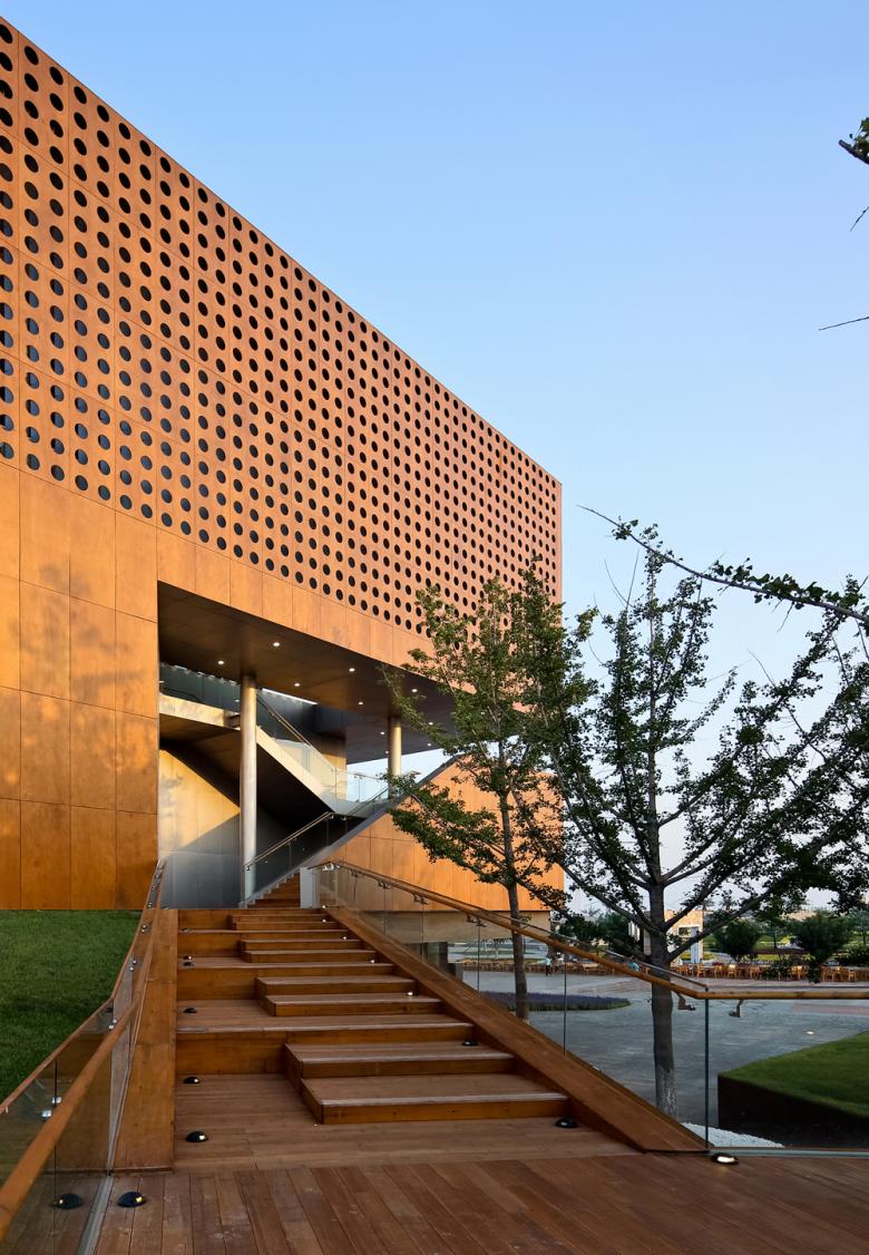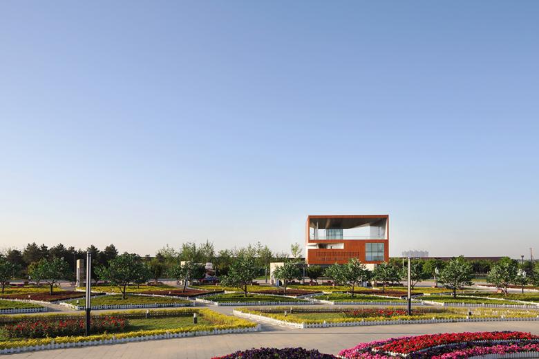 In this way the Vanke Brand Centre became a public venue that is reflected in the design of the cubic building. The box-like form of the pavilion grows out of an organic shape created by a sloped landscape around the first floor. This integrates the building in the surrounding decorative green public space.