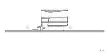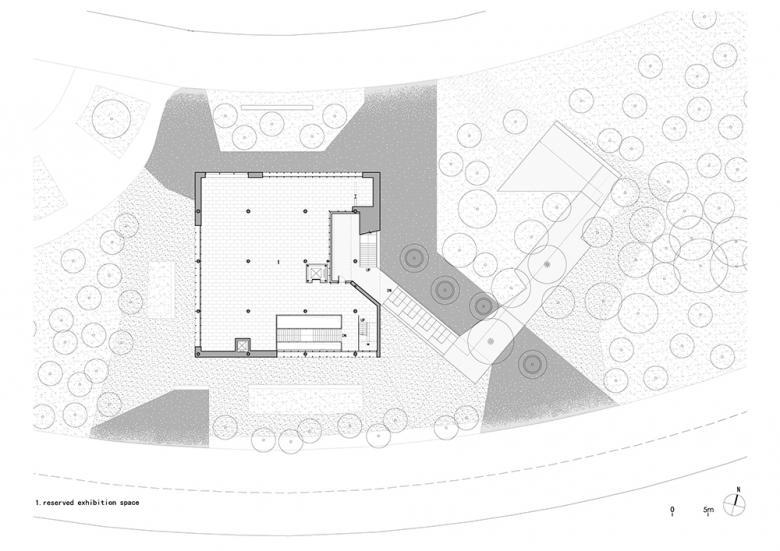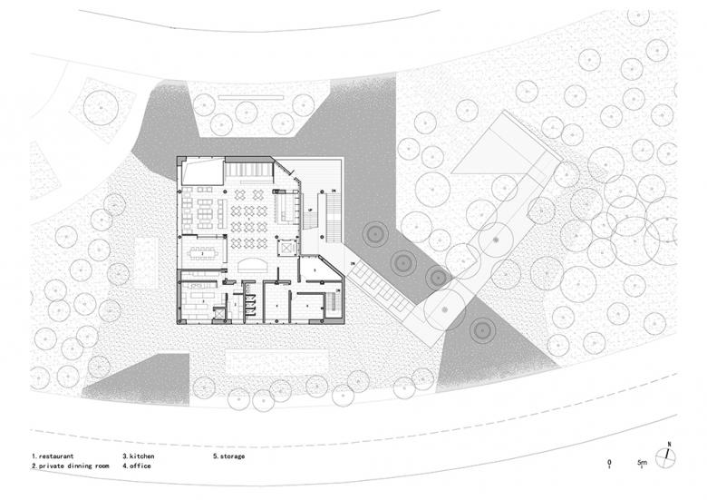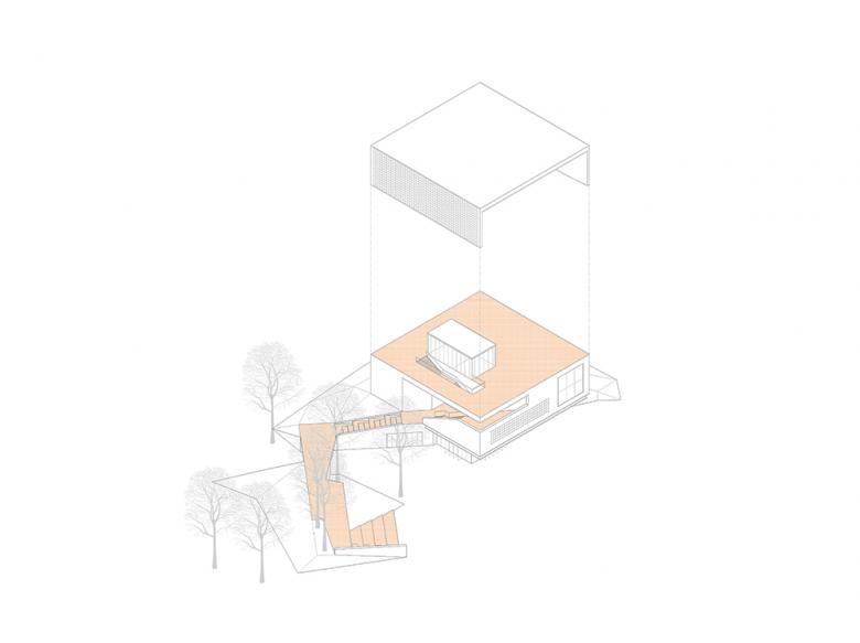 Vanke uses the ground and first floor for its business activities. They are directly accessible from the street in front. The ground floor consists of a lobby, exhibition space, offices and service space. The first floor is reserved for exhibitions. The second floor is fully occupied by the restaurant that is accessible across an outdoor ramp and an open staircase, cut out from the cubic volume. This entry allows visitors to reach independently the final open platform at the third floor.