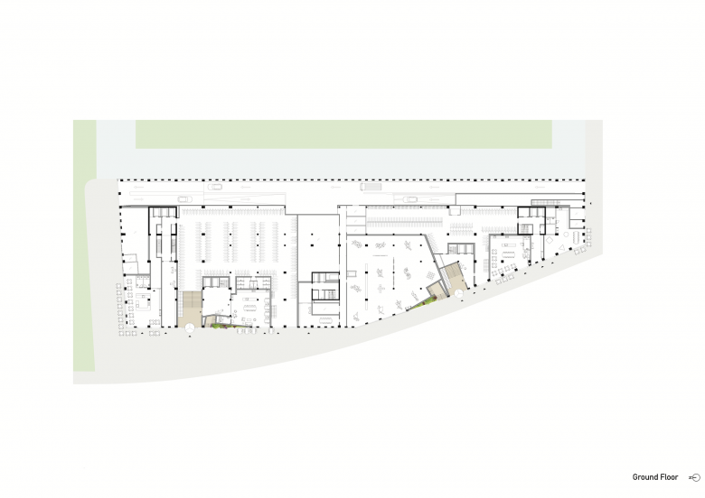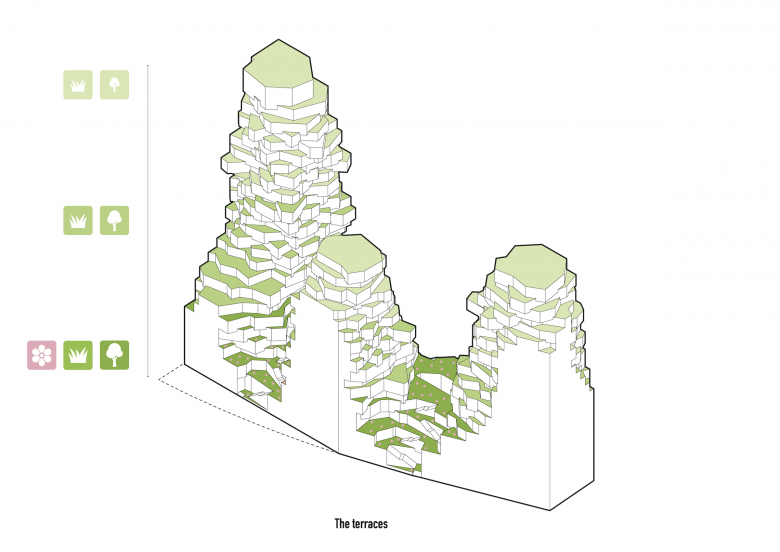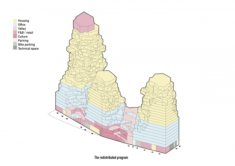 From street level, a path running along terraces and roof gardens leads up to the valley. It spreads across the fourth and fifth levels and surrounds the central tower. By placing the towers on top of the plinth and pushing them to the edge, the volume reads as one single entity.