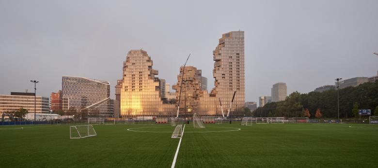The pixelated three-tower silhouette is easily recognizable. Like a mirror-glass block that was broken open, it has three peaks of different heights, with valleys in between. These peaks detach from the outer shell with jutting natural stone facades. According to the architects, a "livable and multifunctional place like an urban oasis, shaped by nature" should complement the Zuidas (or South-Axis) office district. While the built reality is far from an oasis, it is unusual to see a sign at a private development that literally invites the general public to climb its podium.