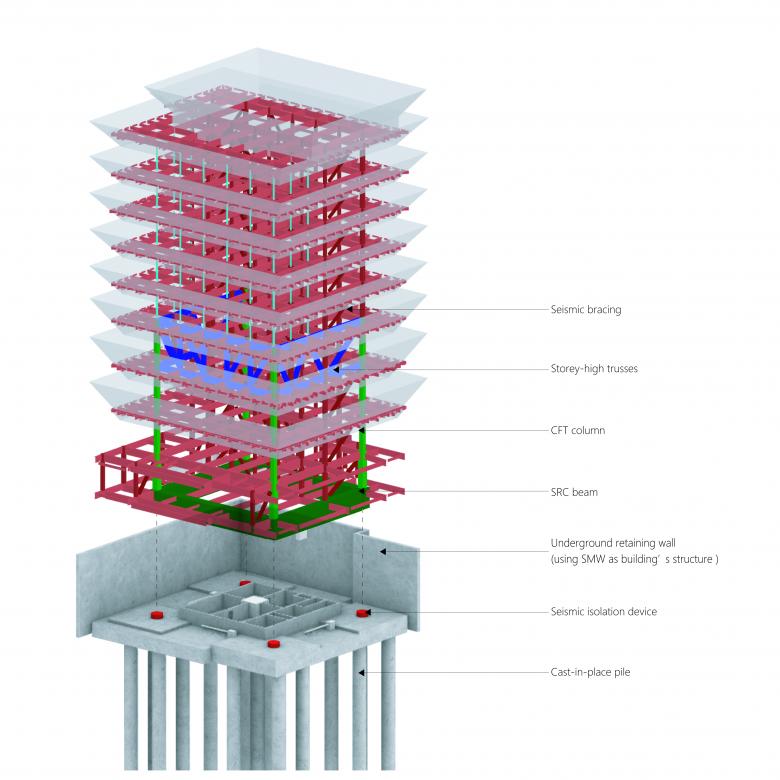 We had debates with the architect about whether or not to incorporate the balcony surrounded by the characteristic slanted walls into the main structure. To be able to adjust the story height and the wall angle on every floor and to frame the sky view between the walls without any obstruction by structural elements, we decided to isolate the slanted walls from the main structural frame. With offices on the fourth floor and above, studios on the third, and an entrance with a double-story void on the first and the second floors, the building vertically stacks spaces that require different spatial qualities. By using the third-floor studio space as a transfer structure with story-high trusses, we connected the relatively small column grid on the upper office floors with the structural system consolidated to the columns on the four corners on the lower floors. The CFT (concrete-filled tube) columns are placed on the four corners to consolidate the load on top of the underground seismic isolation devices. This minimizes the number of devices installed while suppressing the pull-out strength, achieving a rational seismic isolation system. We strived to bring together the different spatial volumes stacked vertically by a structural system that aligns with the architectural design. – Mitsuhiro Kanada, Arup