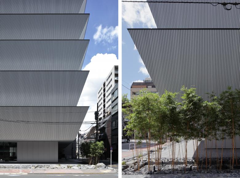 We placed the areas mainly used by visitors on the lower floors, while the level of privacy and confidentiality increase as one goes higher. On the second and third floors that face the elevated railroad tracks, we placed programs that require isolation from the outside such as the theater and the studios. The slanted walls are higher on the lower stories surrounded by existing buildings, whereas they are lower on the upper stories offering a greater sense of openness.