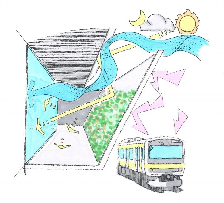 The slanted walls protect the interior from the external gaze, making it impossible to tell what the building is for from the outside. Not being able to see the purpose is much the same for natural landscapes. The slanted walls are made of thin, ten-centimeter-wide aluminum plates, a material of relatively familiar scale to humans. Rather than constructing a large building with large modules, we brought small-scale things together to create a bigger scale. This approach echoes the way nature is formed and grows. By adopting such a method of creation and making the building an object that does not give away information just like the natural landscape, the architectural work becomes part of a new townscape.