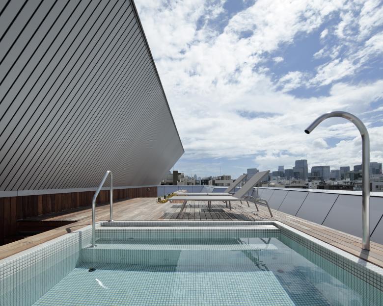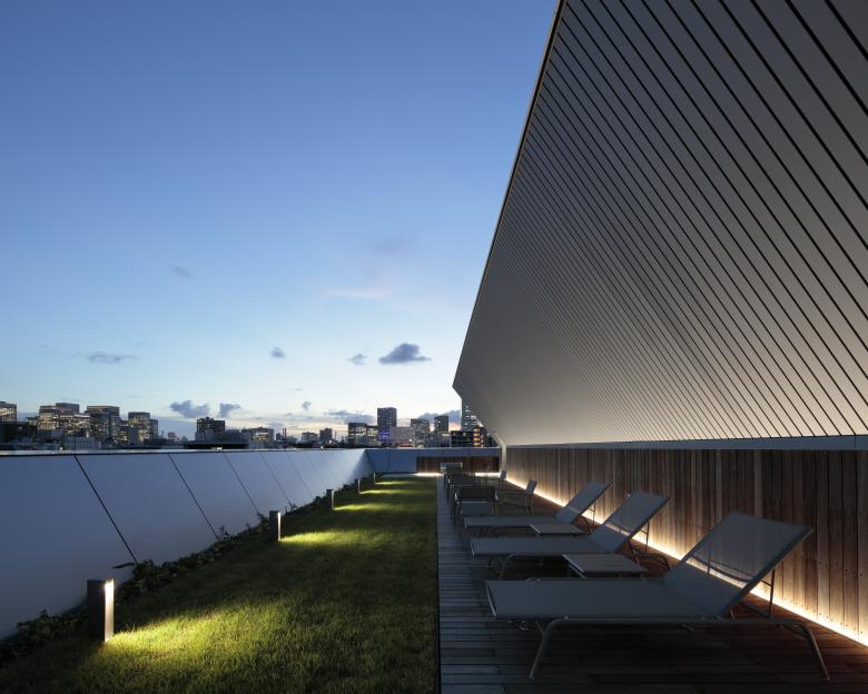 The geometry of the balcony adopted the parametric design method using Grasshopper. It is planned to optimize three environmental parameters: shielding direct light, controlling incident indirect light, and soundproofing railroad noise. The slanted walls also serve as wind catchers to take in the prevailing wind blowing north-south. Moreover, highly efficient equipment, including air conditioning, ventilation, lighting, CO2 concentration control, and rainwater utilization equipment are combined to realize high environmental performance throughout the building. The main building equipment adopts an open protocol KNX system, an international standard with high interconnectivity. The configuration allows centralized management of each device, which is introduced to such a building scale in Japan for the first time. In addition to air conditioning control, pool water temperature control, and security systems, DALI control, another open protocol, is adopted for lighting equipment. It allows dimming and switching on/off each fixture from KNX. – Hirotaka Ogihara, Arup