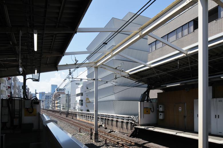 The slanted walls of this eight-story office building in Tokyo appear anti-social, even aggressive at first glance, but they are a logical response to an adjacent elevated railway line, the need for acoustic privacy in the offices, and the desire for natural air and light. Makoto Yamaguchi Design sent us some text and images on the project.