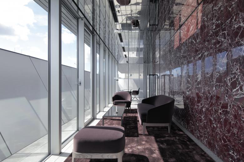 The project is a relocation of the headquarters of a game production company based in Tokyo. It aims to become a place for the highest level of creation that captivates fans worldwide and for supporting the foundation of the game production process. As almost all employees engage exclusively in creative operations, we focused mainly on providing a balance between concentration and relaxation while significantly removing the burden of operational work. We strove to achieve this by introducing slanted walls that characterize the exterior and a system to control all facilities, including security, with tablets.