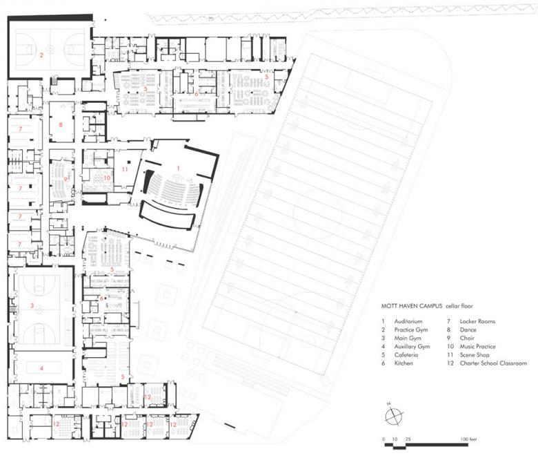 The Mott Haven Campus is a unique project in many respects; its size, location, and the community it serves. Labeled the “largest construction project” of its time, addressing the scale of the facility was a priority. Although there were some built in efficiencies due to the shared nature of some of the specialty spaces, the overall development was much larger than any other project built by the SCA. In the sense that the school would function both as a school for students during the day and a community use facility at night, the dual-use aspect was one our firm was familiar with from previous schools work.