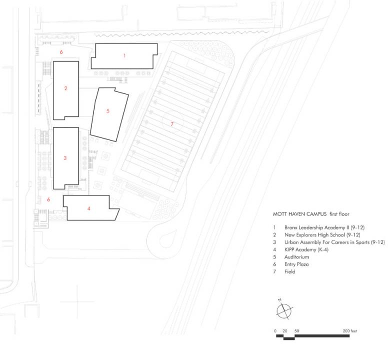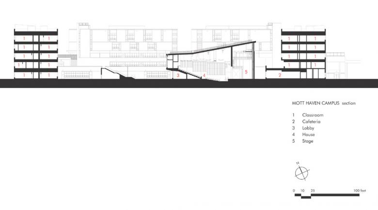 The Mott Haven Campus marked the emergence of a new facility solution that addresses the growing demand for seats while providing an economy of scale in both capital costs and operational expenses. In response to the proven benefits of a small school model, more recently adapted into “small learning communities,” the design team programmed a campus of four distinct schools that share programmatic elements. The solution, which also solved the challenge of a site 15-30 feet below street level, was to locate the four schools above a podium of shared spaces. With this design, the dining and recreation spaces open onto the field, while the schools face the street, providing a contextual and welcoming front door.