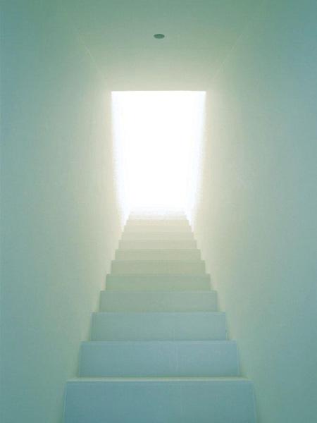 The white entrance and the stairs reminds of the beautiful scenery waiting outside.