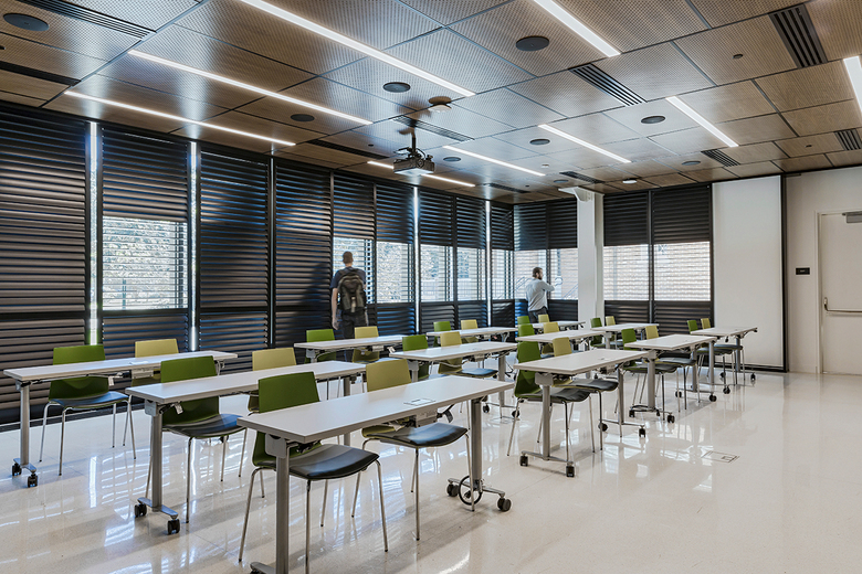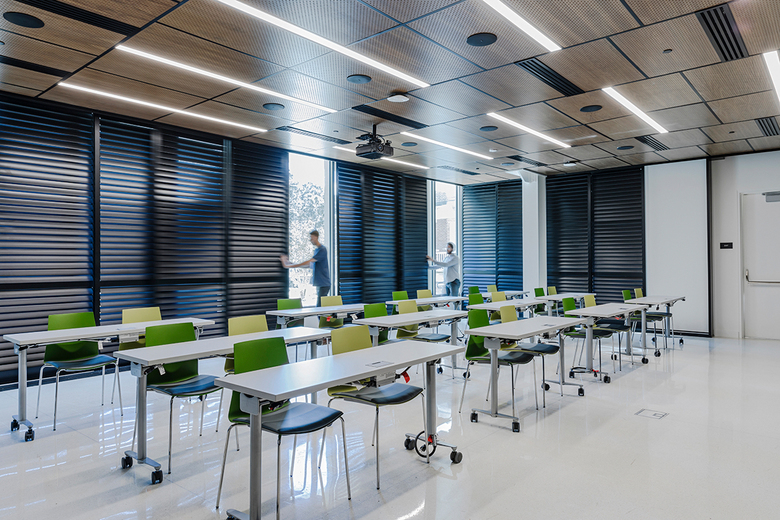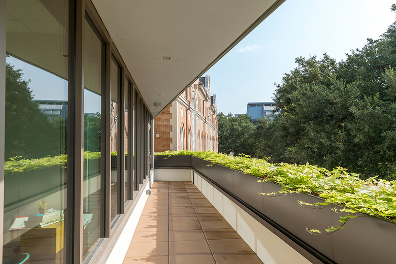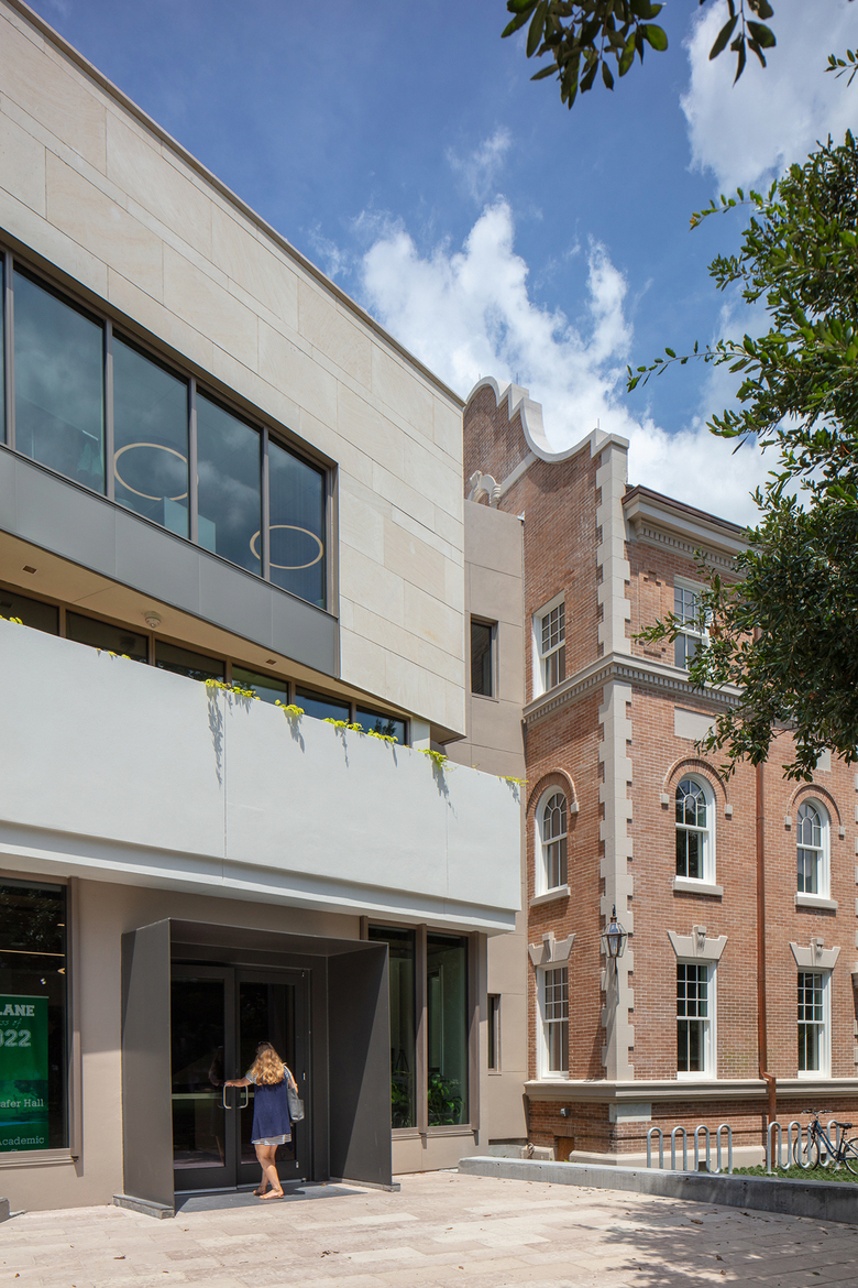 Nestled between two existing historic structures, a road, and a 100-year-old live oak tree, the 7,600-sf addition was largely shaped by its small footprint and unique context. Mussafer Hall’s triangular footprint is respectfully set back from the historic building and angled away from the tree to protect its roots and canopy. studioWTA’s inspiring modern design navigates the space with a series of shifting cantilevered volumes clad in stucco, limestone, and glass. The materials suggest a sense of permanence appropriate for a prominent university and echo the brick, stone, and cement used in the adjacent structure. The recessed second-floor storefront deepens the expression of the cantilever above, which partially shades a large roof terrace designed to take full advantage of the New Orleans climate.