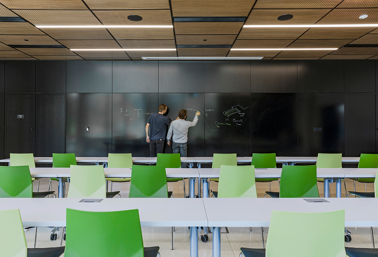 A matte black marker board (Clarus) surrounded by ebony wood panels provides a magnetic writing surface in the flexible use room that gives functionality to the room during lectures, while also remaining ‘stealth’ when the room is used for alternate events such as Career Fairs, registration and training. The discrete marker board provides a sophisticated solution for a multi-functional room.