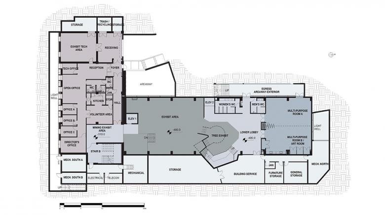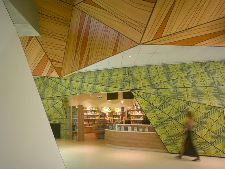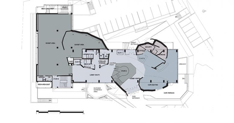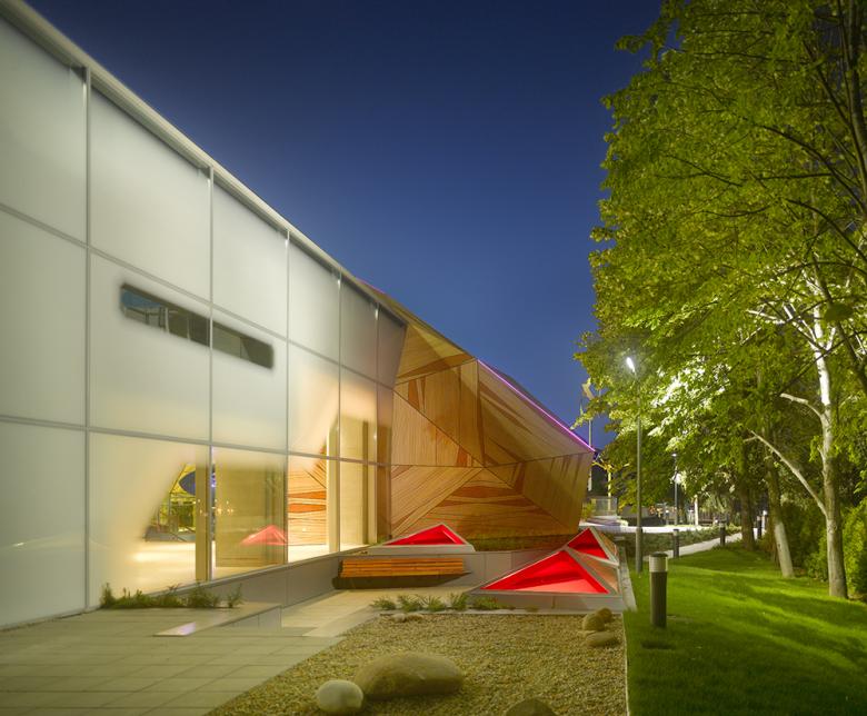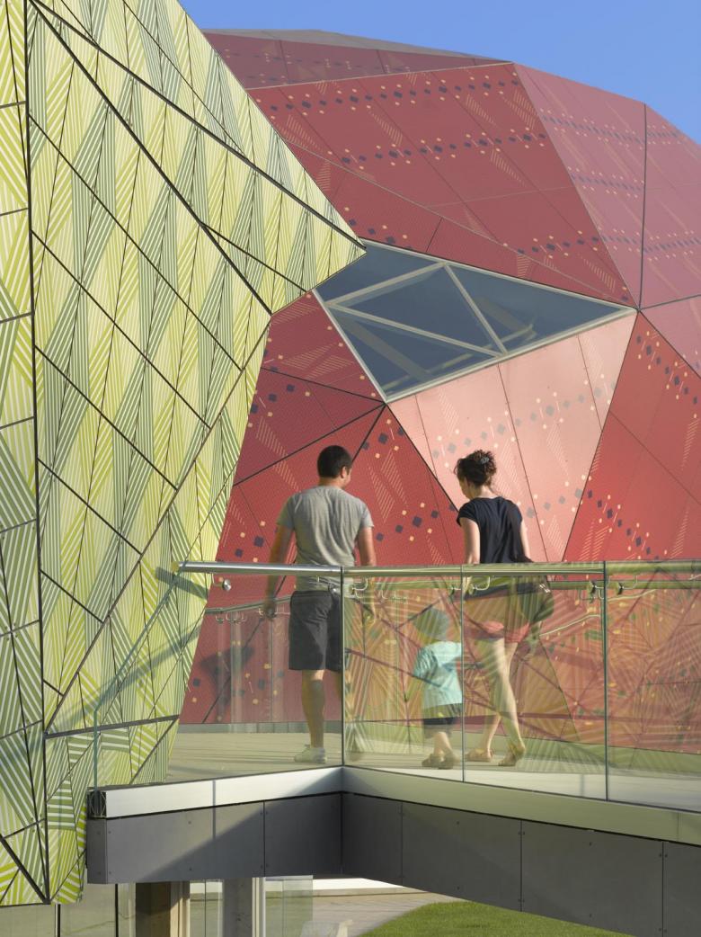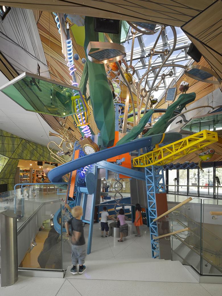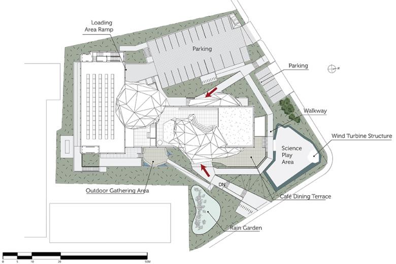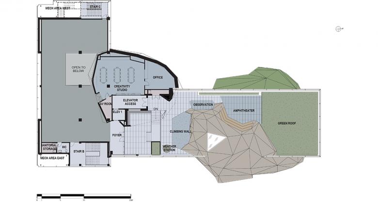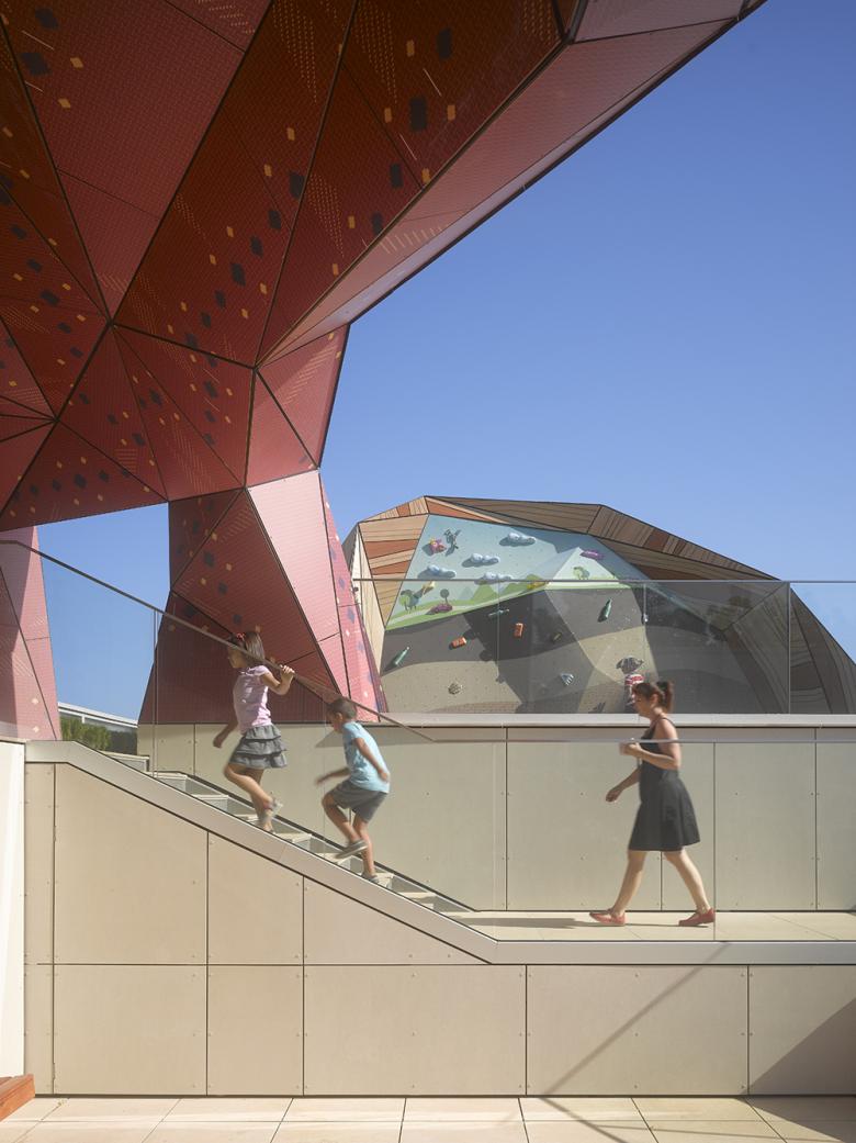 Interactivity also infuses the site which includes a science playground, a green roof and rooftop climbing wall, a rain garden, outdoor activity space and an amphitheater.